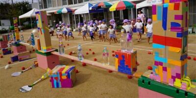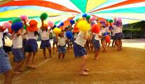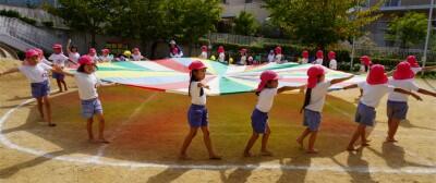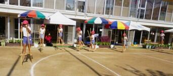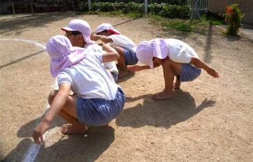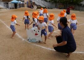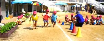 遊びが終わった後、年長組の先生のお話をしっかり聞こうと思うぶどう組さん。そんな姿(成長)は運動会に向けて、子ども達と一緒に遊びをつくってきたからなのです。