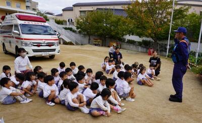 芦屋市消防本部東山出張所から消防隊の方と救急車が来てくださいました。避難訓練をしている様子を見てもらい、「上手にできています」と褒めていただきました。