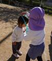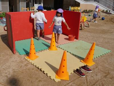 そして、みかん組さんはぶどう組さんが運動会でしていた「手作り的に玉を当てて倒す」遊びに挑戦!