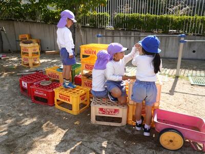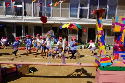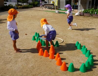 みかん組さんは運動会で遊んだものを使ったり、ぶどうさん、ざくろさんが使っていたものに興味津々だったりしています。