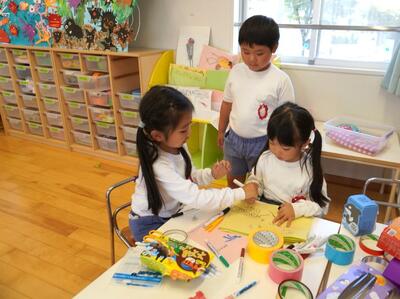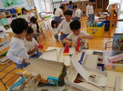 ざくろ組さんはクラスで話し合った後、グループの友達と会話しながら遊びに必要なものをつくり始めてました(何ができるのかな?)